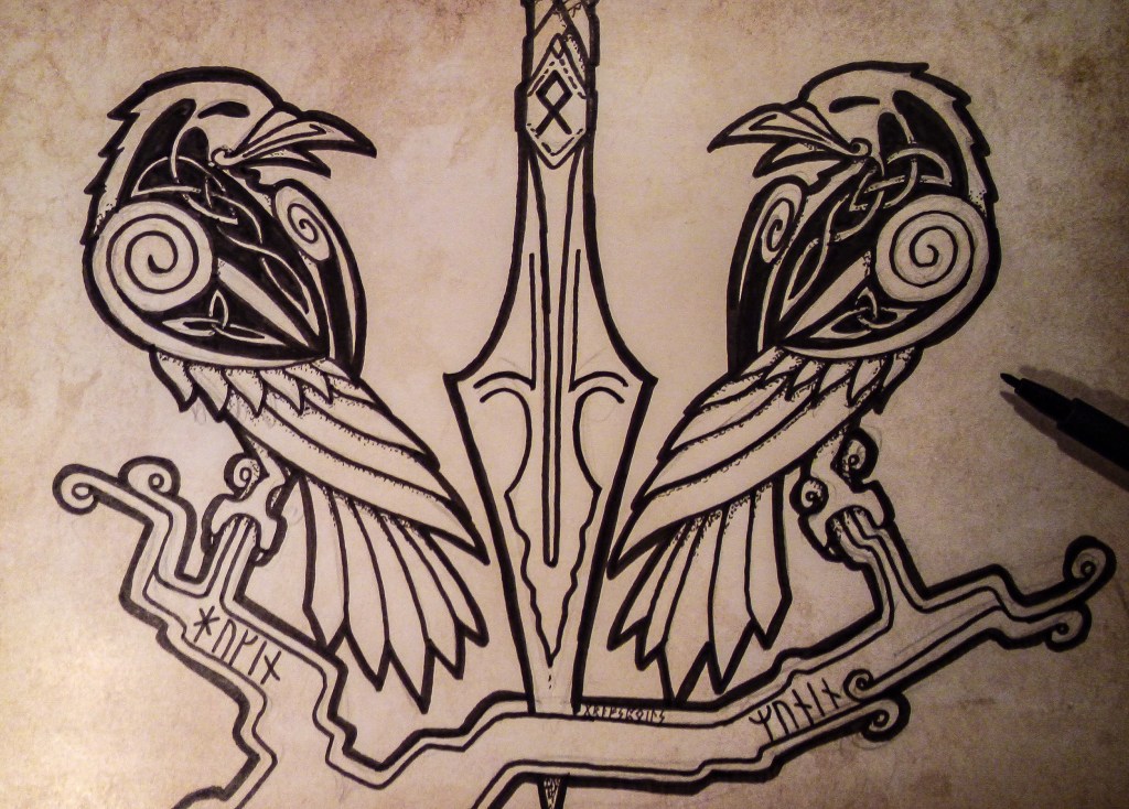 Hugin and Munin, the raven companions of Odin, the Allfather. They fly throughout the nine realms and return by night to tell the Allfather the tidings of the worlds. Their names mean “Thought” and “Memory”, representatives of knowledge, which Odins seeks by any means necessary.